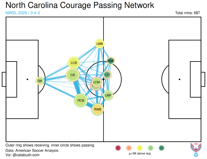 The most likely explanation is that over half of their games in a 4-back system were played when Denise O’Sullivan was out due to a knee injury; one of these games they played a midfield of Jaedyn Shaw and Shinomi Koyama, neither of whom are anyone’s idea of destroyers. But this level of getting gashed is concerning; being this vulnerable in the center is a large change from the 2024 season, when they were basically average.