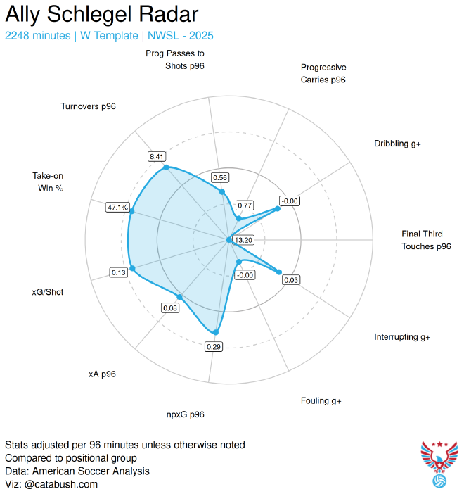 On a raw metric basis, she was one of the standout attackers in the class, making progressive runs, attacking (and winning) 1v1s, playing final passes, and getting quality shots. For the stats that may translate to defense, she had a high success rate for both offensive and defensive duels.