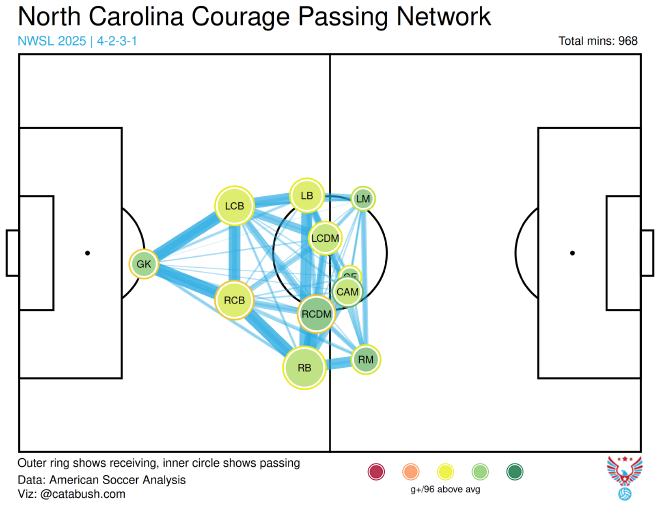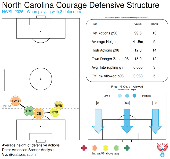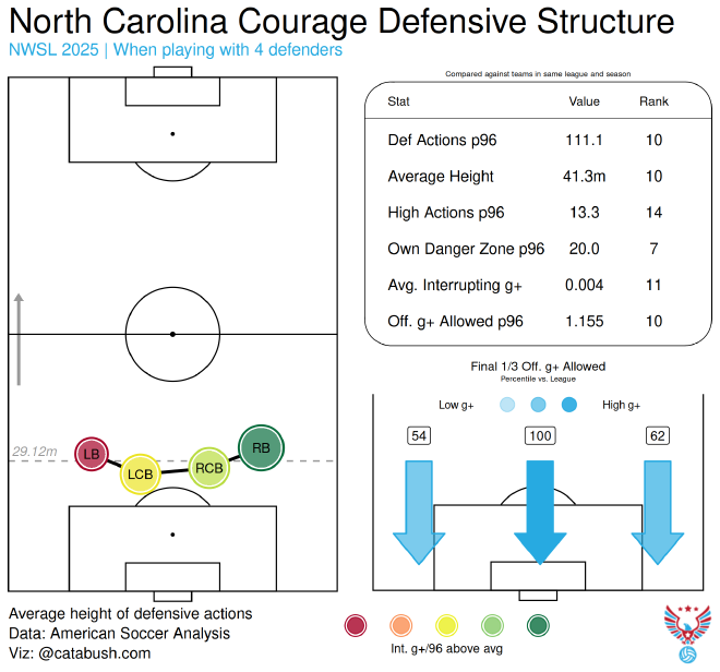 One disturbing trend with this layout appears if you look at American Soccer Analysis’s defensive stats. When the Courage played with four at the back, they were literally in the 100th percentile for g+ allowed down the middle.
