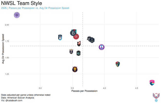 While under Nahas in 2024, the Courage were in their own possession zipcode, having the slowest buildup with the most passes. Under Thackeray, they moved somewhat faster, as they were now only the second slowest and most possession-happy team.