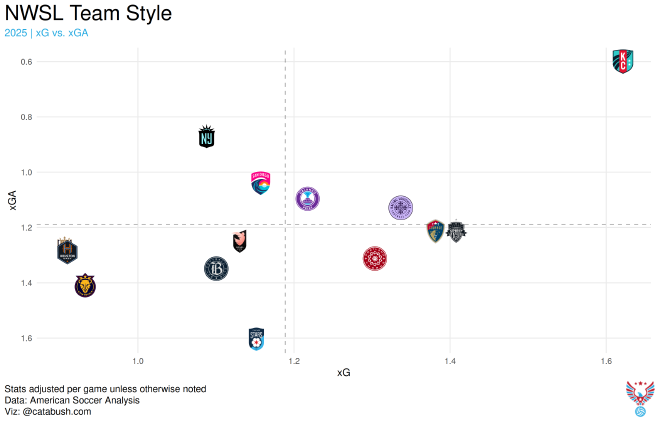 The most likely explanation is that over half of their games in a 4-back system were played when Denise O’Sullivan was out due to a knee injury; one of these games they played a midfield of Jaedyn Shaw and Shinomi Koyama, neither of whom are anyone’s idea of destroyers. But this level of getting gashed is concerning; being this vulnerable in the center is a large change from the 2024 season, when they were basically average.
